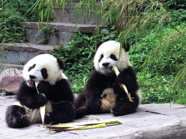 حيوانات الباندا العملاقة تأكل قصب البامبو في المركز الصيني للدراسات والحفظ بعد أن ضرب الزلزال بقوة 7 درجات على مقياس ريختر مدينة يان، جنوب غرب الصين أول من أمس. وتتواجد هناك نحو 60 باندا تحت الرعاية، حيث توفي من جراء هذا الزلزال نحو 100 إنسان، وجُرح 3 آلاف أخيراً.