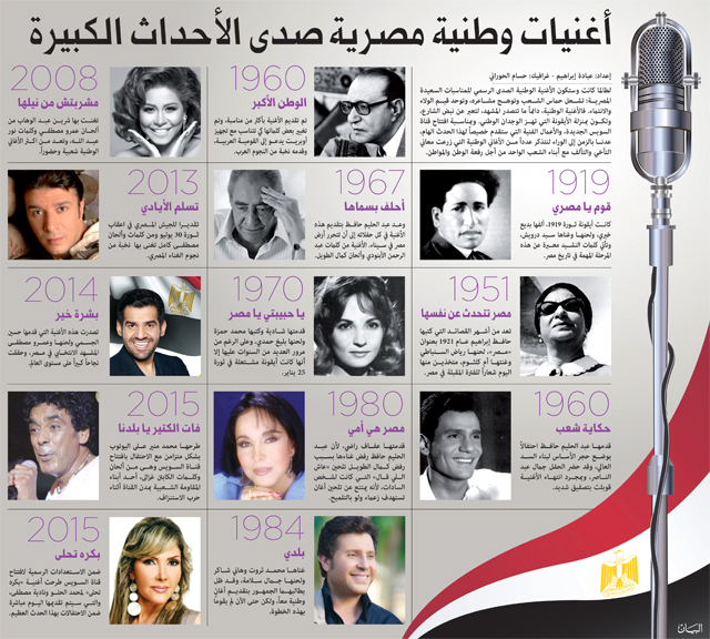 لطالما كانت وستكون الأغنيات الوطنية الصدى الرسمي للمناسبات السعيدة؛ تشعل حماس الشعب وتوهج مشاعره، وتوحد قيم الولاء والانتماء. فالأغنية الوطنية، دائماً ما تتصدر المشهد، لتعبر عن نبض الشارع، وتكون بمنزلة الأيقونة التي تهز الوجدان الوطني. وبمناسبة افتتاح قناة السويس الجديدة، والأعمال الفنية التي ستقدم خصيصاً لهذا الحدث الهام، عدنا بالزمن إلى الوراء لنتذكر عدداً من الأغاني الوطنية التي زرعت معاني التآخي والتآلف مع أبناء الشعب الواحد من أجل رفعة الوطن والمواطن.