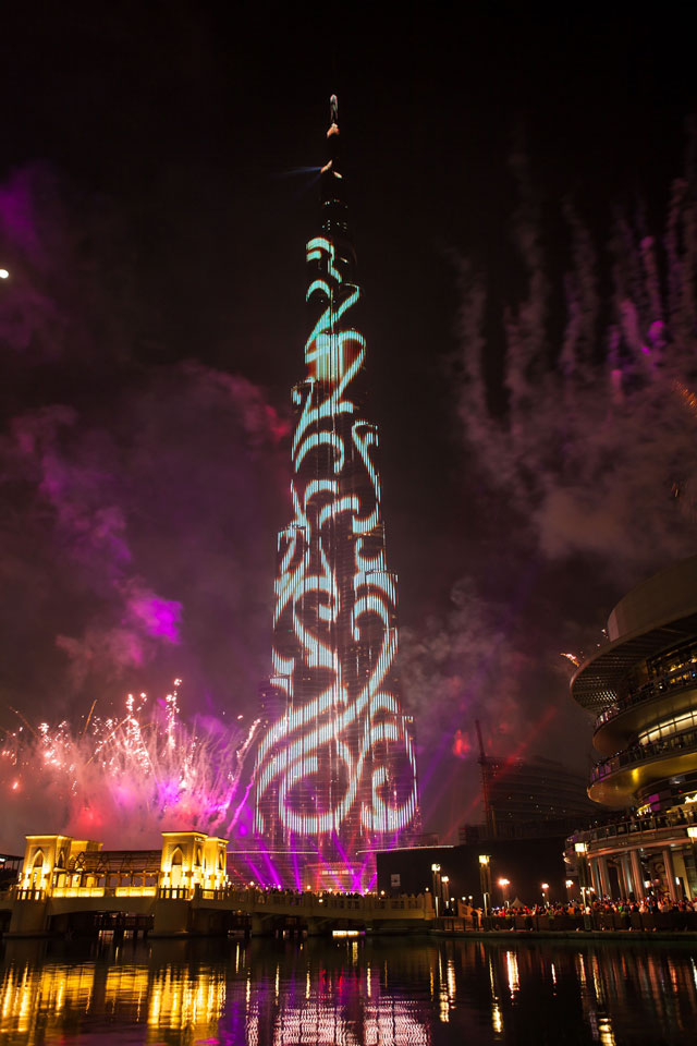 وتزداد روعة احتفالات العام الجديد في "وسط مدينة دبي" مع التصاميم والأطياف اللونية المتنوعة التي تظهر على شاشة LED الساحرة التي تزين واجهة "برج خليفة" بارتفاعه الشامخ الذي يبلغ 828 متراً (2716.5 قدم). وتتألف الشاشة من نحو 375 ألف ضوء LED، فيما يسلط العرض الضوء على مواضيع عدة في مقدمتها تحية لإنجازات دولة الإمارات العربية المتحدة على مر السنين.