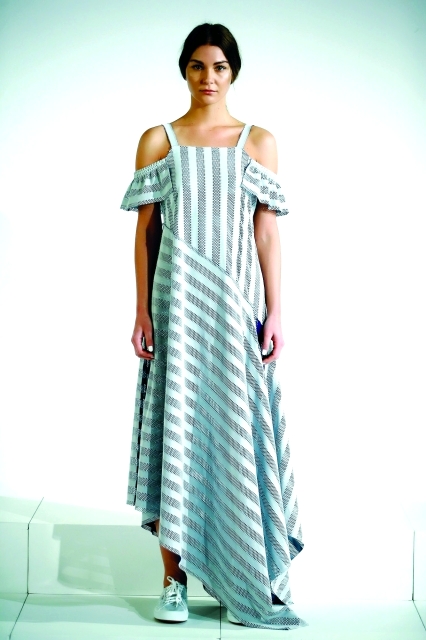 وفى السياق، تقول أندريا فراج، إن تشكيلة «الرمال البيضاء»، اعتمدت خلالها قماشاً يابانياً (مايكروفايبر) (خالٍ من التجاعيد)، إلى جانب قماش شبكي مصبوغ قابل للقلب (خالٍ من التجاعيد)، مع إضافة حرير مثقب 100 في المئة، و«فيسكوز، إيلاستين» أي القطن المثقب، والقطن المغزول (خالٍ من التجاعيد)، وإضافات متعددة من حرير شيفرون المنسوج لخلق نسيج حشوة (دون طباعة)، وبالتالي، هي في مجملها خامات صديقة للبيئة.