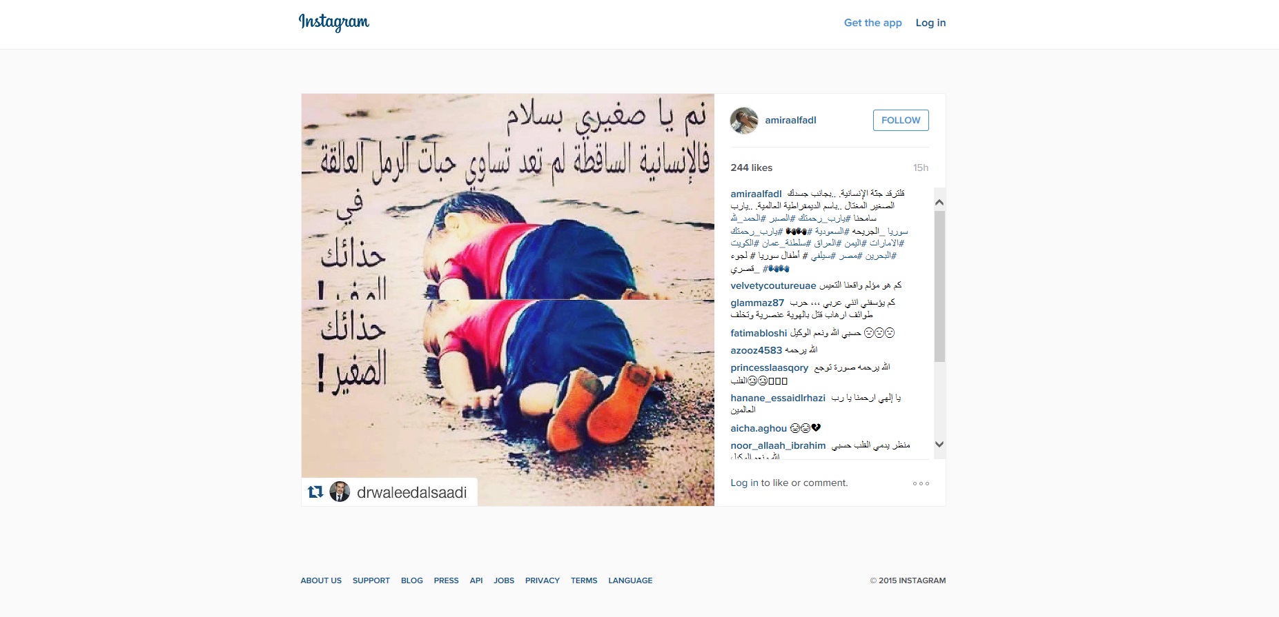 لم تكن أميرة الفضل التي تشارك في مشروع #هاشتاق_ونص، الذي تطلقه البيان عبر موقعها الإلكتروني وحدها التي أبدت حزنها الشديد، فثمة نجوم شاركوا العالم حزنه على هذا الطفل البريء، فقد كتبت الفنانة لانا الجندي بإحساس حزينٍ ومؤلمٍ "آخر الواصلين إلى الجنة عبر البحر.. التهمة سوري".