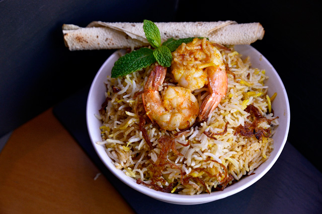 600 غ قريدس متوسط الحجم (مقشّر ومنظّف)، 80 غ سمن، ملح حسب الرغبة، 10 غ مسحوق القرفة، 5 غ مسحوق الفلفل الأحمر، 5 غ مسحوق الكركم، 2 غ نانخة (بذور الكمون)، 60 غ معجون الزنجبيل، 60 غ معجون الثوم، 100 غ بصل مقطّع إلى شرائح، 100 غ طماطم مقطّعة إلى شرائح، 50 غ لبن (مخفوق)، بضعة عروق زعفران، 400 غ أرز بسمتي، 60 غ زبدة، 100 مل قشدة، 10 غ بصل أحمر، 5 غ أوراق نعناع.