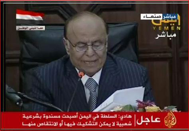 وبموجب الدستور اليمني يعتبر هادي رئيساً لليمن منذ اليوم بعد أداءه اليمين الدستورية.