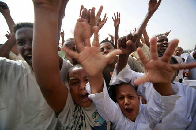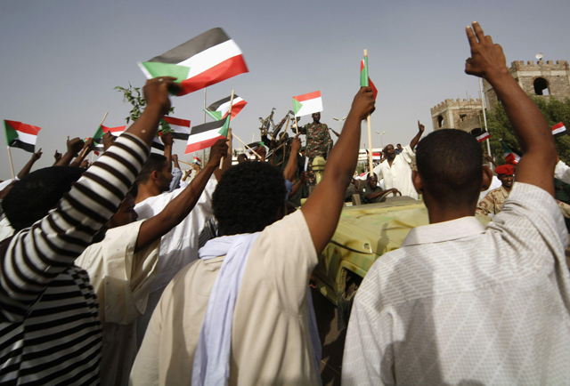 وهتف الحشد وهو يلوح باعلام سودانية "الله اكبر" و"شعب واحد جيش واحد"، داعيا الجيش الى التوجه الى جوبا عاصمة جنوب السودان.