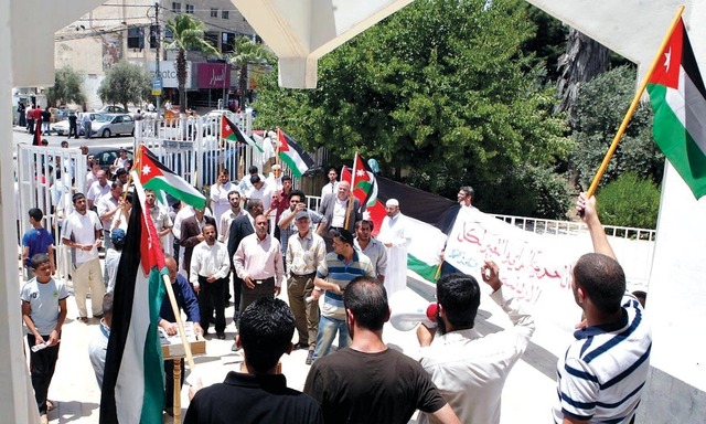وشارك في مسيرة العاصمة الاردنية عمان امس نحو ثلاثة آلاف شخص، وهي المسيرة الثالثة التي تنظمها الجبهة التي تضم في عباءتها مجموعة كـــبيرة مـــن أحزاب المعارضة على رأسهم الاسلاميين ونقابيين ومستقلين. ولأسباب صحية فيما يبدو، انتظر عبيدات المسيرة إلى حين وصولها إلى ساحة النخيل.