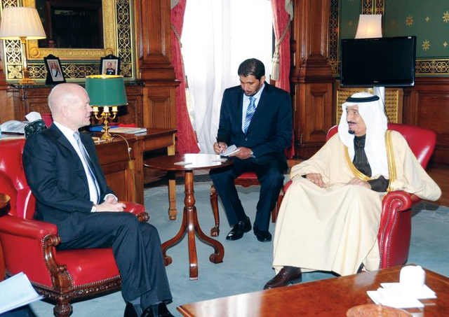 رحب وزير الخارجية البريطاني ويليام هيغ أمس بوزير الدفاع السعودي الأمير سلمان بن عبد العزيز في مقر الوزارة، وذلك في إطار زيارته الحالية للمملكة المتحدة، حيث أجرا الطرفان مباحثات حول العلاقات الثنائية والقضايا الإقليمية. وعقب الزيارة، قال هيغ: «سررت بزيارة الأمير سلمان بن عبد العزيز لوزارة الخارجية، إذ يربطنا تاريخ طويل من الصداقة والتعاون مع المملكة العربية السعودية، وهي شريك وحليف مهم لنا في المنطقة».