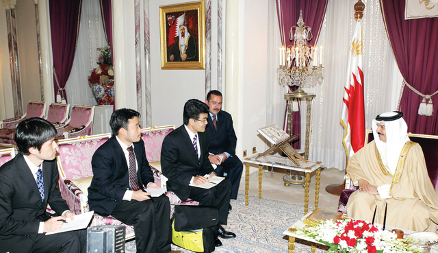 واستقبل العاهل البحريني في قصر الصافرية أول من أمس وفداً إعلامياً يابانياً، ضم ممثلين عن العديد من وسائل الإعلام اليابانية، منها هيئة الإذاعة والتلفزيون اليابانية «إن إتش كيه» ووكالة الأنباء اليابانية، وصحيفتا «أساهي شيمبون» و«نيكي»، حيث اجرى الوفد لقاءً صحافياً وتلفزيونياً مع ملك البحرين بمناسبة الزيارة المرتقبة إلى اليابان. وتطرق الملك حمد بن عيسى آل خليفة، بحسب ما افادت مصادر، إلى «العلاقات الطيبة التي تربط البلدين الصديقين.