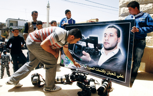 كاميرات زملاء المصور الصحافي اللبناني علي شعبان امام صورته خلال تشييعه في جنوب لبنان.
