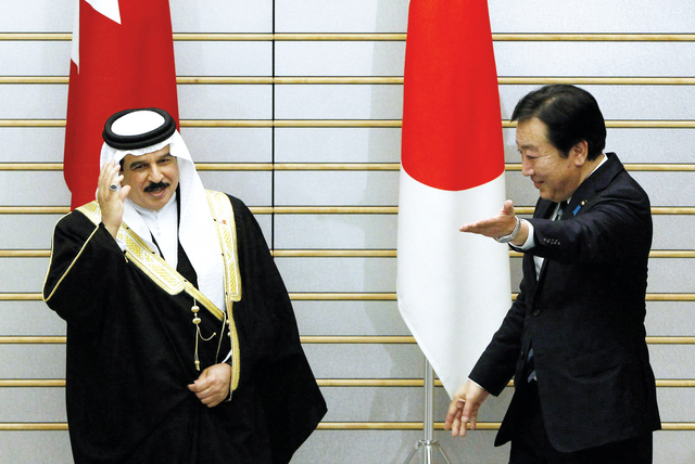 العاهل البحريني الملك حمد بن عيسى آل خليفة لدى وصوله أمس إلى العاصمة اليابانية طوكيو وفي استقباله رئيس الوزراء الياباني يوشيهيكو نودا، وتأتي زيارة العاهل البحريني بدعوة رسمية من إمبراطور اليابان اكيهيتو، ويرافقه فيها وفد كبير يضم نائب رئيس الوزراء ووزراء الخارجية والصناعة والتجارة والطاقة.