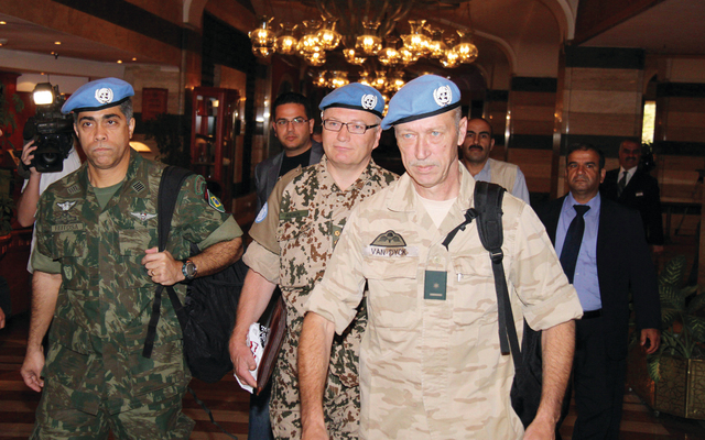 وعقد الفريق المؤلف من ستة أشخاص يرتدون اللباس التابع للأمم المتحدة كاملًا، اجتماعاً مقرراً في مقر وزارة الخارجية في وقت مبكر من صباح أمس، وقال مسؤول سوري لوكالة الأنباء الألمانية «نرغب في أن يبدأوا مهمتهم في حمص، حيث إنها مازالت منطقة تشهد خروقات يومية لوقف إطلاق النار».