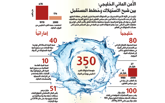 دقّ أمين عام مجلس التعاون لدول الخليج العربية عبداللطيف بن راشد الزياني ناقوس الخطر الذي يتهدد دول المجلس في ما يتعلق بمستقبل مخزون المياه، داعياً إلى إعداد خطة خليجية استراتيجية شاملة لطوارئ المياه ومعتبراً أن الماء سيكون على رأس سجل المخاطر في دول المجلس في المستقبل، فيما أكد وزير الطاقة والصناعة القطري أن مقترح إنشاء شبكة مياه خليجية على غرار شبكة الكهرباء يجري بحثه حالياً في الأمانة العامة لدول التعاون.