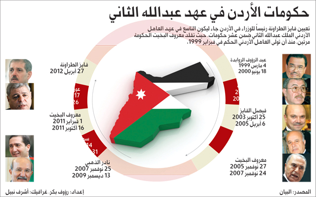 وبحسب مصادر، فإن شخصيتين كانتا في ذهن القصر لرئاسة الوزراء، بعد أن وافق على استقالة الخصاونة الاولى: أول رئيس وزراء في عهد الملك عبدالله الثاني عبد الرؤوف الروابدة والثانية فايز الطراونة. الا ان الروابدة استبعد لعلاقاته «المتشنجة» مع الإسلاميين، اضافة الى ترجيح كفة الطراونة كون شخصيته «تمتاز بالمرونة اكثر».