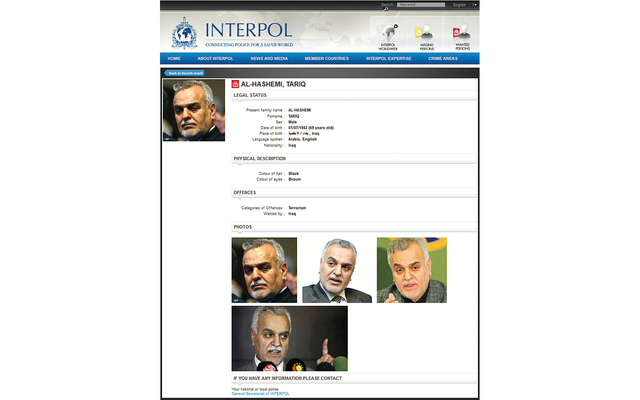 وذكرت «الإنتربول» في بيان أمس أنه «أصدر مذكرة حمراء بحق الهاشمي التي تمثل إشعاراً دولياً لجميع أعضاء الشرطة الدولية الـ190 للمساعدة في تحديد موقعه واعتقاله، بعد مذكرة اعتقال وطنية صدرت من سلطة التحقيق القضائية العراقية كجزء من تحقيق صادرت القوى الأمنية خلاله مواد متفجرة واعتقلت عدداً من الأشخاص». وقال الأمين العام للشرطة الدولية رونالد نوبل من مقرها في مدينة ليون الفرنسية إن المذكرة الحمراء بحق الهاشمي «ستقيّد بشكل كبير قدرته على السفر وتجاوز الحدود الدولية، وهي أداة قوية ستساعد السلطات حول العالم على تحديد موقعه واعتقاله».