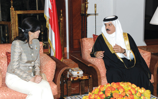 استقبل العاهل البحريني الملك حمد بن عيسى آل خليفة رئيسة الوزراء التايلندية ينجلوك شيناواترا. وأشاد الملك حمد بن عيسى لدى لقائه شيناواترا بما يربط مملكتي البحرين وتايلند الصديقين من علاقات طيبة في كافة المجالات، مؤكدا حرص بلاده واهتمامها بتطوير آفاق التعاون الثنائي المشترك في المجالات الاقتصادية والتجارية والاستثمارية والتنموية. ووقع الوفد الحكومي التايلندي أمس مع الحكومة البحرينية ثلاث مذكرات تفاهم في المجالات السياحية والثقافية ومجال الأمن الغذائي.
