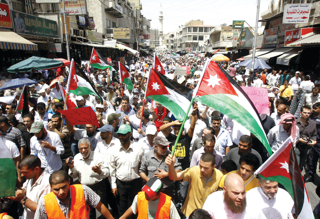 خرج متظاهرون أردنيون في احتجاجات أمس، مطالبين بإصلاح الدستور مع رفض قاطع لزيادة الأسعار، إذ رفعوا لافتات أبرزها «بدنا إصلاح الدستور خلي الشعب يشوف النور» و «ولى عهد الخوف وراح يا بتصلح يا بترتاح»، فيما طالب نائب برلماني بتشكيل حكومة «إنقاذ وطني» لا يشارك فيها أي من المسؤولين السابقين.