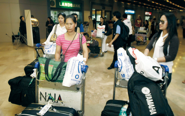 عمال وعاملات فلبينيون عائدون إلى بلادهم في مطار نينوي أكينو في مانيلا، أمس، فارين من القتال العنيف الذي تشهده سوريا، وشكل 31 شخصاً آخر دفعة من العمال الذين تنجح الحكومة في إعادتهم منذ بداية الأزمة في سوريا منتصف مارس من العام الماضي. وأوضحت الحكومة الفلبينية أن عدد من تم إعادتهم إلى مانيلا بلغ منذ مارس من العام الماضي 1743 شخصاً.