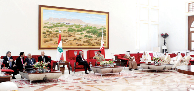 استقبل العاهل البحريني الملك حمد بن عيسى آل خليفة، أمس، الرئيس اللبناني العماد ميشال سليمان في زيارة ضمن جولة في عدد من دول المنطقة. وخلال اللقاء، الذي حضره رئيس الوزراء البحريني الأمير خليفة بن سلمان آل خليفة، استعرض العاهل البحريني والرئيس اللبناني العلاقات الوثيقة بين البلدين الشقيقين في مختلف المجالات، وأكدا أهمية تطوير آليات العمل المشترك بما يعكس رغبة البلدين في تنمية هذه العلاقات تحقيقاً لآمال الشعبين الشقيقين وتطلعاتهما المشتركة، كما عبرا عن ارتياحهما لما تشهده العلاقات بين البلدين من تقدم في العديد من المجالات.
