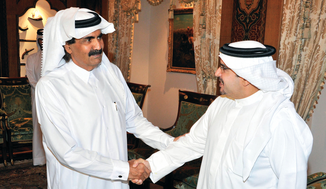 أمير دولة قطر الشيخ حمد بن خليفة آل ثاني مستقبلاً ولي العهد البحريني الأمير سلمان بن حمد آل خليفة في الدوحة .