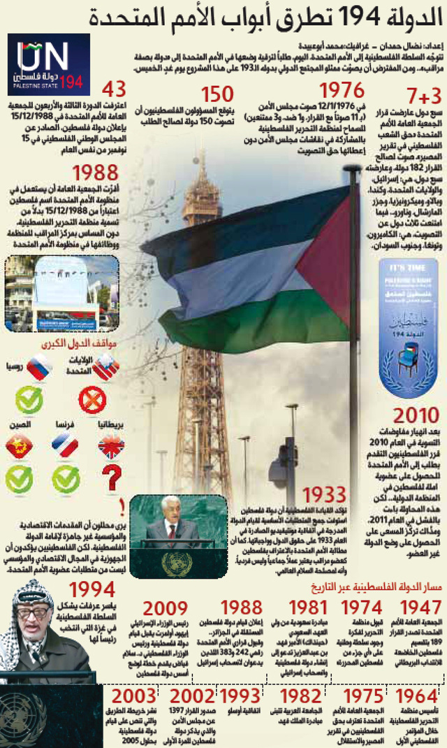 في الاثناء، وزعت البعثة الدبلوماسية الفلسطينية لدى الأمم المتحدة المشروع النهائي للطلب. وقال السفير الفلسطيني لدى الأمم المتحدة رياض منصور، للإذاعة الفلسطينية الرسمية، إن لدى البعثة ثقة بالحصول على أغلبية مريحة عند طرح مشروع الطلب للتصويت.