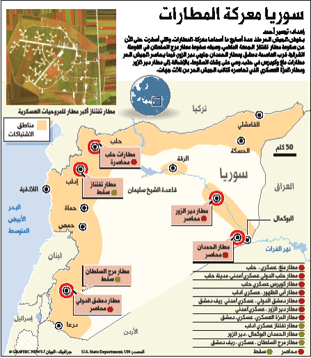 واشتد القتال أمس بين الثوار وقوات النظام السوري في محيط أكثر من مطار عسكري بريف حلب، بعد سقوط مطار تفتناز بريف إدلب في قبضة قوات المعارضة السورية، واشار الناشطون إلى انهيار معنويات ودفاعات القوات النظامية المحاصرة في مطارات منّغ وكويرس والنيرب في حلب وريفها، وقرب استسلام حامياتها بعد انقطاع الإمدادات عنها.
