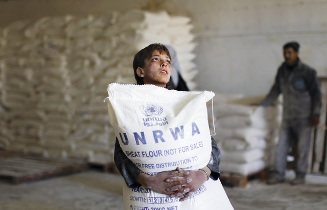 طفل فلسطيني يحمل كيس دقيق لنقله إلى عائلته في مدينة غزة، شمال القطاع الساحلي المحاصر، والذي يعيش سكانه على المعونات التي تقدمها لهم وكالة غوث وتشغيل اللاجئين "الأونروا"، التي لا تلبي كافة احتياجاتهم الإنسانية، كما أنها تنقطع أو تتأخر بين الحين والآخر نتيجة نقص التمويل المقدم للوكالة.