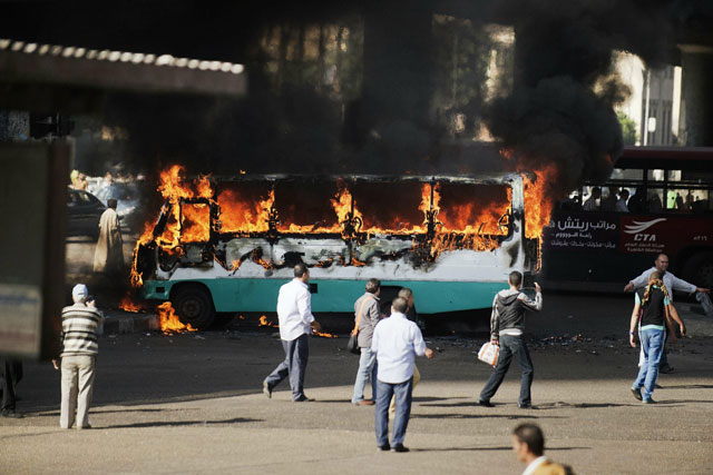 وبدأت الاشتباكات عندما توجه متظاهرون من معارضي مرسي من ميدان التحرير في اتجاه شارع رمسيس المجاور حيث يحتشد الالاف من انصار جماعة الاخوان المسلمين التي ينتمي اليها الرئيس واحرقوا حافلة تابعة للجماعة.
