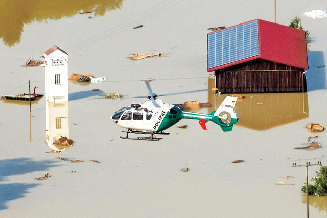 مروحية تابعة للشرطة تحوم فوق المنطقة التي غمرتها المياه في مدينة ديجاندروف جنوب ألمانيا، حيث تشهدأوروبا فيضانات هي الأسوأ منذ أكثر من عقد خلفت خراباً في عدد من الدول، بينما انهمك آلاف المجريين منذ ليل الخميس في تدعيم السدود على ضفاف نهر الدانوب، الذي ارتفع مستوى مياهه، فيما تستعد بودابست لاستقبال فيضانات غير مسبوقة.