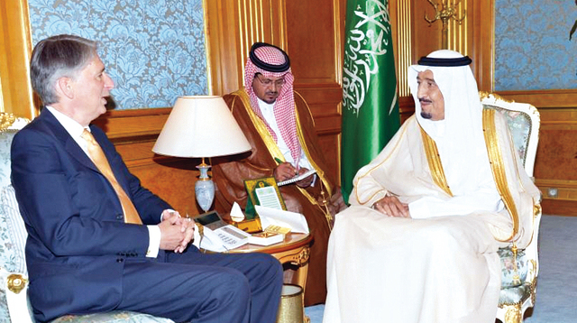 ولي العهد السعودي ووزير الدفاع الأمير سلمان بن عبدالعزيز خلال لقائه وزير الدفاع البريطاني فيليب هاموند الذي يزور الرياض حاليا لبحث التعاون العسكري بين بلديهما.