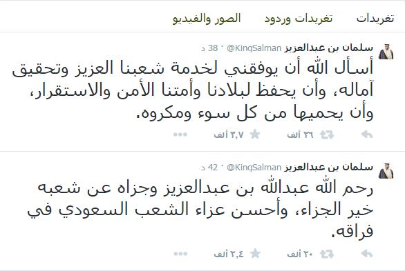 وقال الملك سلمان في تغريدته الأولى، ناعياً أخاه الملك عبد الله: "رحم الله عبدالله بن عبدالعزيز وجزاه عن شعبه خير الجزاء، وأحسن عزاء الشعب السعودي في فراقه".