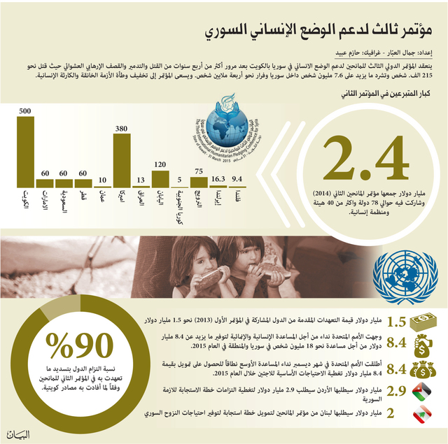 وتستضيف دولة الكويت في 31 مارس الجاري مؤتمر المانحين الثالث لدعم الوضع الإنساني في سوريا بعد استضافتها المؤتمرين الأول والثاني في 2013 و2014 بمشاركة 78 دولة وأكثر من 40 هيئة ومنظمة دولية.