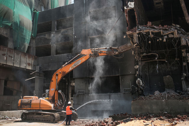 وعلى بعد بضعة أمتار من المتحف المصري، هدم عمال المبنى بالجرافات. وكان المبنى ظل مهجورا وبقيت واجهاته سوداء من آثار الحريق الذي شب فيه إبان ثورة 2011.