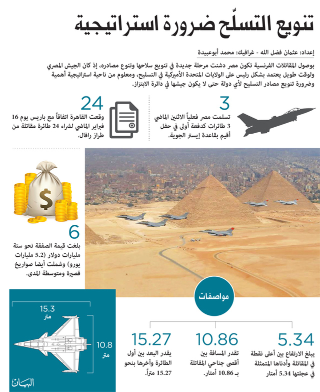 شهد القائد العام للقوات المسلحة المصرية وزير الدفاع والإنتاج الحربي الفريق أول صدقي صبحي، أمس، مراسم الاحتفال بوصول وانضمام أول ثلاث طائرات من طراز رافال الفرنسية التي تعد الدفعة الأولى ضمن الصفقة التي أبرمتها مصر مع فرنسا في فبراير الماضي والتي تقضي بتسليم 24 طائرة "رافال" وفرقاطة متعددة المهام من طراز فريم.