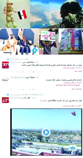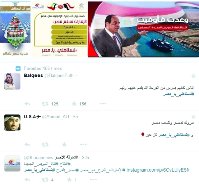 وغرّد سهيل العبدول قائلاً: «كل إنجاز يحققه الشعب المصري يسعدنا ويفرحنا وكأنه إنجاز وناجح لنا»، أما شيخان الكلباني فغرّد قائلاً: «مصيرنا واحد وفرحتنا معاهم». وأعاد عدد من المغردين نشر تقرير نشرته «البيان» بشأن تفاعل مواطني الدولة مع افتتاح قناة السويس الجديدة عبر وسائل التواصل الاجتماعي وخاصة «تويتر».