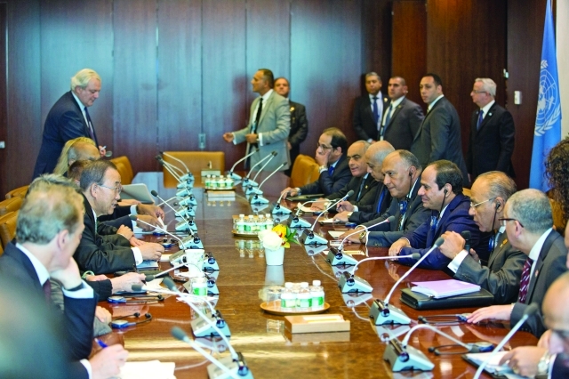 وأشاد الرئيس المصري بالدور البناء للأمين العام للأمم المتحدة بان كي مون وسعيه الدؤوب لتنفيذ مبادئ ميثاقها، الذي ظل دستورًا للعلاقات الدولية، ومرجعًا لها طوال سبعين عامًا.
