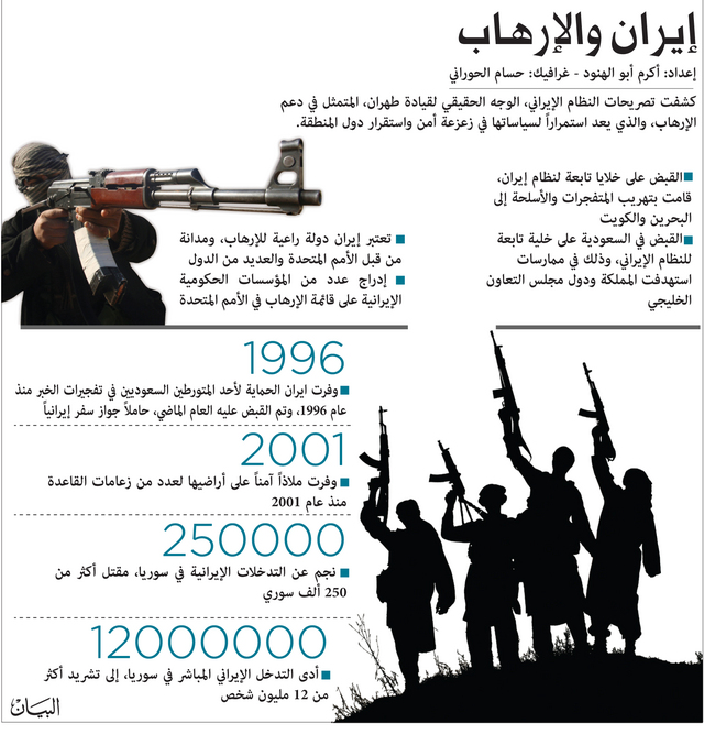 ونقلت وكالة الأنباء السعودية «واس»، عن المصدر، أن نظام إيران آخر نظام في العالم يمكن أن يتهم الآخرين بدعم الإرهاب باعتباره دولة راعية للإرهاب، ومداناً من قبل الأمم المتحدة والعديد من الدول، ويؤكد ذلك إدراج عدد من المؤسسات الحكومية الإيرانية على قائمة الإرهاب في الأمم المتحدة.. إضافة إلى توفير ملاذ آمن على أراضيه لعدد من زعامات القاعدة منذ عام 2001 علاوة على توفير الحماية لأحد المتورطين السعوديين في تفجيرات الخبر التابع لما يسمى بـ«حزب الله الحجاز» منذ عام 1996، والذي تم القبض عليه في العام الماضي حاملاً جواز سفر إيرانياً.