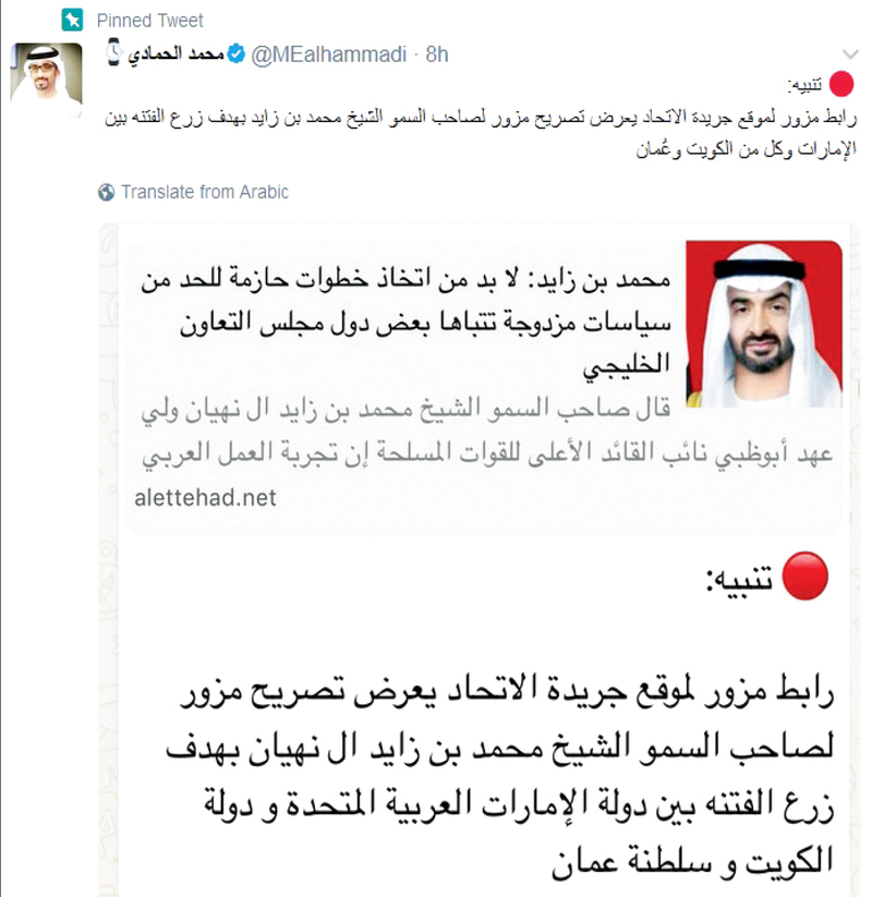 وحذر محمد الحمادي، رئيس تحرير صحيفة الاتحاد، في حسابه الرسمي على «تويتر»، من هذا الرابط المزور، معتبراً أن الغرض منه بث الفتنة بين الإمارات والكويت وسلطنة عمان.