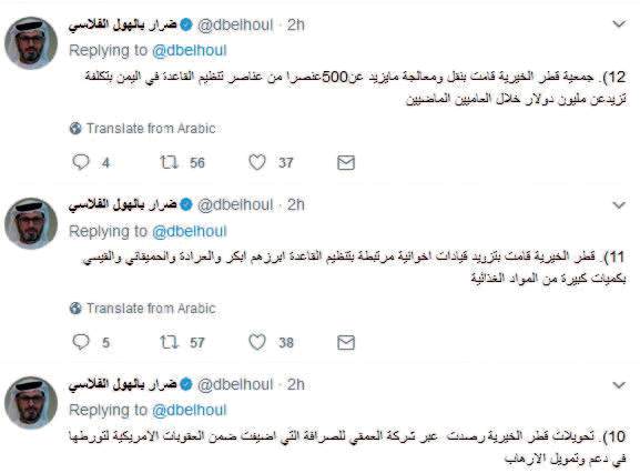 وخصص الكاتب والمحلل السياسي ضرار بالهلول الفلاسي سلسلة تغريدات تفضح، بالأرقام والوقائع، أبرز أنشطة مؤسسة قطر الخيرية في دعم وتمويل الإرهاب، مثل «توفير العلاج ونقل قرابه 500 جريح من جرحي القاعدة و داعش والإخوان في مستشفيات قطر بتكلفة تزيد عن مليون دولار خلال العامين الماضيين، وتقديم شحنات غذائية كبيرة لقيادات إخوانية يمنية مرتبطة بالقاعدة كمساعدات إنسانية وبيعها في السوق السوداء لتمويل أنشطة إرهابية».