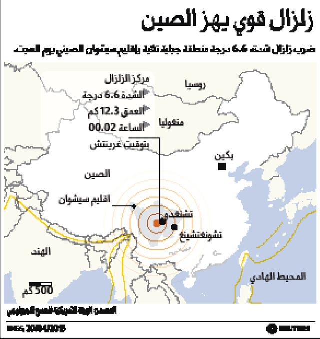 وقع زلزال بلغت قوته 6.6 درجات في منطقة جبلية نائية يغلب عليها الطابع الريفي في إقليم سيشوان جنوبي غربي الصين أمس، ما أوقع 124 قتيلاً على الأقل فضلاً عن إصابة نحو 2500، قرب المنطقة التي وقع فيها زلزال قوي عام 2008 قتل نحو 70 ألف شخص.