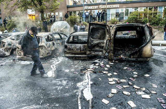 عدد من المركبات أتت عليها الحرائق في إحدى ضواحي العاصمة السويدية ستوكهولم بسبب أحداث الشغب التي اندلعت الأحد الماضي في أحياء المهاجرين.
