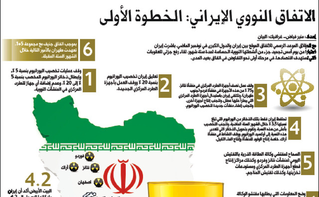خطا الاتفاق النووي الإيراني الدولي خطوته الأولى نحو التطبيق، مع إعلان طهران تعليقها نشاطات تخصيب اليورانيوم بنسبة 20 في المئة، في إطار الاتفاق الموقع مع القوى الكبرى. ورداً على ذلك، خففت كل من الولايات المتحدة والاتحاد الأوروبي سلسلة من العقوبات الاقتصادية على ايران لمدة ستة اشهر، فيما رفعت الوكالة الدولية للطاقة الذرية تقريراً يؤكد بدء تجميد الأنشطة.
