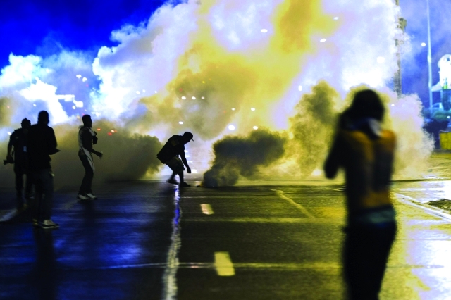 ووقف ضباط يحملون الدروع وسط العربات المصفحة. وأعلن حاكم ميزوري جاي نيكسون حالة الطوارئ، وفرض حظر التجول في فيرجسون بسبب احتجاجات ذات دوافع عرقية وأعمال نهب بعد مقتل مايكل براون (18 عاماً) برصاص ضابط الشرطة دارين ويلسون (28 عاماً) في مقاطعة سانت لويس في التاسع من أغسطس الجاري.