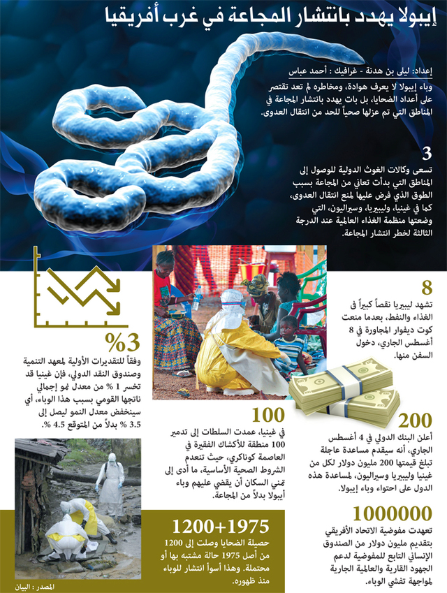 وبحسب الأرقام الجديدة للمنظمة، فإن 113 إصابة جديدة (مؤكدة أو مرجحة أو مشبوهة) و84 وفاة سجلت بين 14 و16 أغسطس في دول غرب افريقيا التي يتفشى فيها المرض. وفي المجموع، احصت المنظمة منذ مطلع مارس الماضي 3469 إصابة ووفيات.