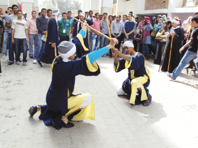 وألمع أشكال الفنون المعبرة عن عدة قضايا، ومنها: مشاهد القوة والسيطرة على النفس (برزت هذه المعالم من خلال احتفاليات رياضية نادرة)، البهجة العارمة في الأفراح الخاصة بالزفاف او قدوم اوالأعياد. بقيت هذه الرياضة الشعبية، حاضرة وذات طابع احتفالي. وهي تشكل مكونا رئيسيا في التراث الشعبي المصري.
