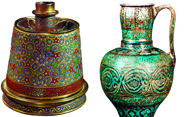 ؟ ابريق: وهو منفذ من خزف مزجج بلون فيروزي على خلفية سوداء. إيراني يعود للعام 1200م. ويحمل العمل تزيينات