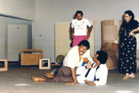 في المنامة، وبعد أن نجح في أن يؤسس جمعية دبي للفنون الشعبية، تحلقت حوله مجموعة من الصبية، من الذين كانوا يعشقون المسرح على فطرتهم، واستطاعوا أن يحركوا فيه عاطفة الأب الذي استجاب لرغبات أولاده، ولروح الإنسان المتطلع إلى تحقيق ما لم يحققه غيره في تلك الفترة، ويقول عنه الفنان المخضرم سعيد عبدالعزيز: