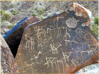 ومنها على سبيل المثال، في حقل ومحور المعالم الأثرية في خورفكان، والذي يبرز اكتشافات (النقوش الصخرية)، الموجودة على سفوح الجبال أو بالقرب من الأفلاج والعيون أو على ضفاف الأودية والأماكن القريبة من الشواطئ البحار، متخذا أشكالاً مختلفة. فمرة نجدها تتخذ تجسيدات نقش رسمي، لبشر أو حيوانات.