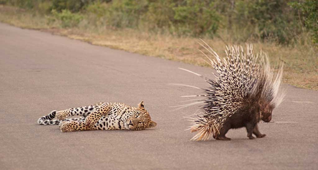 التقطت هذه الصور عام 2012 في حديقة "كروغر" بجنوب أفريقيا بعدسة "ليسل مولمان" إحدى عشاق الحياة البرية. تظهر هذه الصور الفهد وهو يحاول الهجوم على القنفذ الذي يتمتع بقدرات خارقة في الحماية الذاتية، من خلال وخز فريسته بأشواكه الحادة.