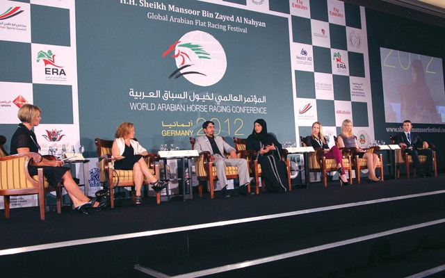 لليوم الثاني على التوالي تواصلت جلسات المؤتمر العالمي الثالث لخيول السباقات العربية "برلين 2012"، تحت رعاية سمو الشيخ منصور بن زايد آل نهيان نائب رئيس مجلس الوزراء وزير شؤون الرئاسة، والتي أقيمت صباح أمس بقاعة فندق ريتز كارلتون في برلين بالمانيا بحضور مئات من المهتمين بصناعة الخيول العربية الأصيلة يتقدمهم الشيخ حامد بن خادم آل حامد رئيس اتحاد الملاكمة.