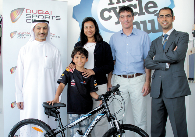 كرم خالد الزرعوني رئيس مدينة دبي الرياضية الدراج الألماني الناشئ كاليو كولب الفائز بسباق نبض دبي للدراجات على الطرق الوعرة الذي نظمته مدينة دبي الرياضية بالتعاون مع مجلس دبي الرياضي ومؤسسة " سايكل هب " المتخصصة في بيع اشهر الماركات العالمية في الدراجات الهوائية.