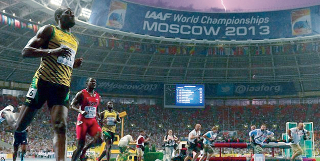 والتقط مصور فرانس برس اوليفييه موران، صورة لبولت خلال سباق 100م، والذي توج به مترافقة مع البرق في سماء العاصمة موسكو.